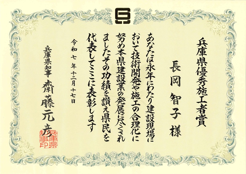 令和7年12月17日に「令和7年度兵庫県優秀施工者賞表彰式」が執り行われました。